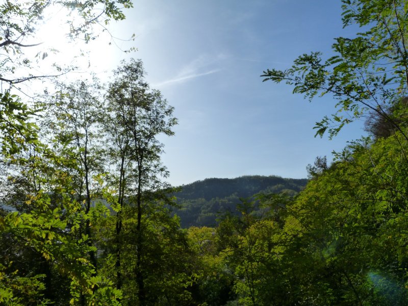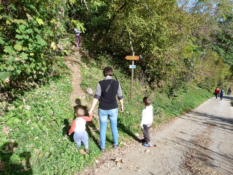 Superiamo il recinto degli asini, saliamo un pochino e poi svoltiamo subito a sinistra prendendo il sentiero che sale in mezzo al bosco. Dopo qualche passo Evelina si gira e mi fa "Però fa caldo" e quindi decidiamo di lasciare i giubbotti appesi ai rami di un albero.