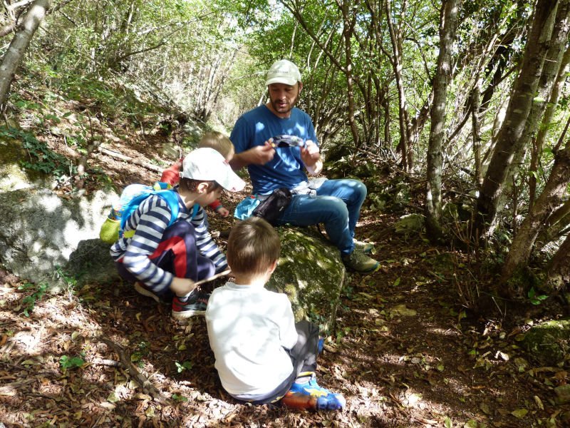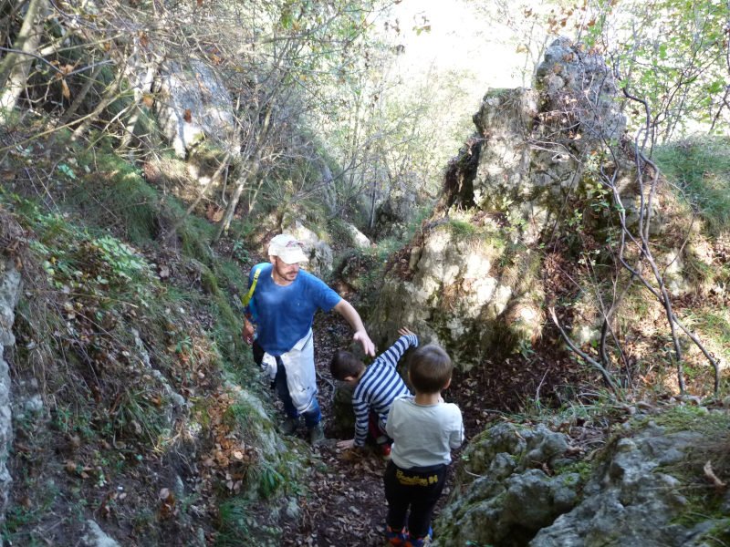 Il sentiero si allarga un po' e facciamo la pausa gioco, Marco Albino vede un foro tra le rocce e vuole esplorarlo. Gli altri con legnetti e sassi muovono le foglie.