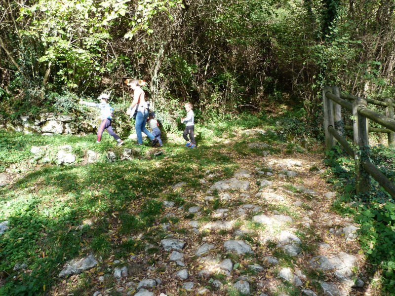 La strada diventa piana, e vediamo alcuni cavalli all'esterno di una stalla. Poco più in là un guado su un torrente in secca. Alcuni sassi sopra una recinzione invitano i viandanti a spaccare le noci e naturalmente noi non ci tiriamo indietro. Tuttavia i bimbi sono più attratti da alcune pozzanghere d'acqua dove buttano i gherigli delle noci che galleggiando diventano delle navi dei pirati.
