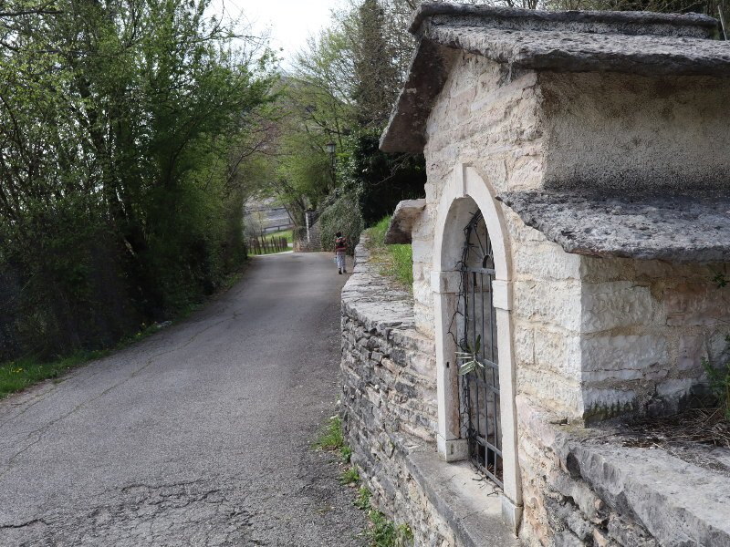 Con questo stratagemma, utilizzato poi successivamente anche con Marco Albino, proseguiamo il cammino quasi senza accorgercene. La salita si fa sentire, ma una volta superata l'ultima casa in pietra, raggiungiamo la vetta di questo tratto di bosco così suggestivo. Da qui, finalmente, può iniziare la discesa, tutta su strada cementata.