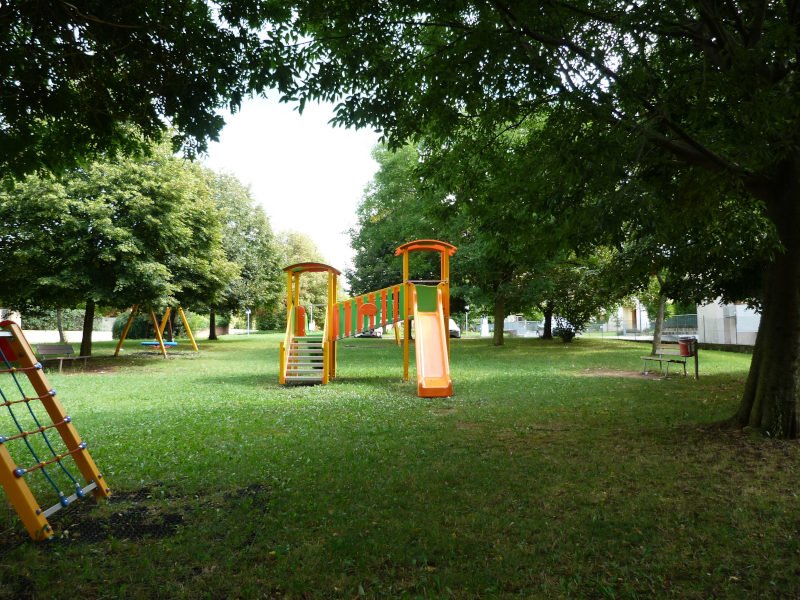 Proseguiamo verso la rotonda e poi sempre dritti fino a vedere un parco giochi sulla destra. Rompiamo i ranghi della ciurma che si precipita verso scivoli, arrampicate sia su giostra che su alberi.