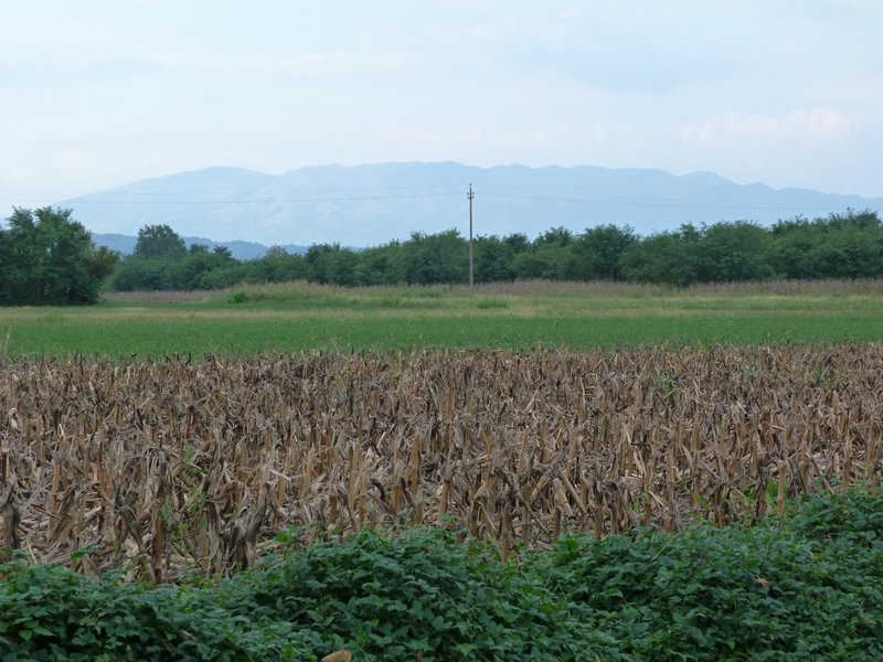 Dopo circa 800 metri giriamo a sinistra per Via Belgiardino, dei cani sentendoci arrivare abbaiano e poco più avanti inizia un viale di tigl. Oltre i campi possiamo scorgere tra la foschia la sagoma del Monte Cesen e delle Prealpi Trevigiane.