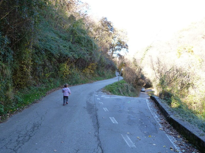 La truppa manifesta un certo appetito e facciamo una sosta. Continuiamo lungo Via Fornetto con Samuele che vuole scendere dal passeggino e comincia a correre, forse deve smaltire l'energia dei corbezzoli. Io gli sto dietro perché ogni tanto passa qualche vettura, siamo pur sempre su strade di paese sebbene poco trafficate.