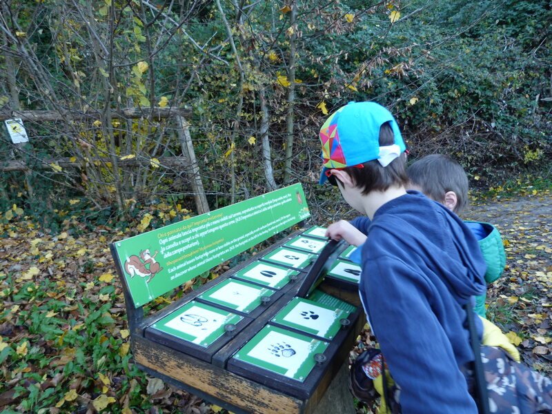 Andiamo avanti e poco dopo i bimbi vedendo delle scalette le salgono e trovano dei pannelli didattici molto divertenti che illustrano le "impronte" lasciate dagli animali sul terreno tra cui gli escrementi. Questo pannello raccoglie l'interesse di tutti, più della mappa che illustra i vari monti all'orizzonte.