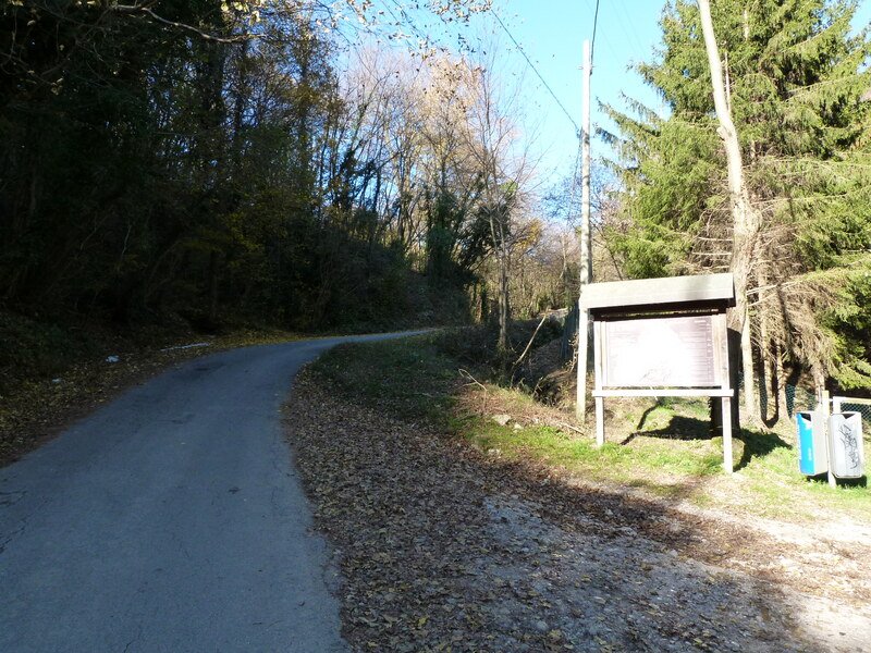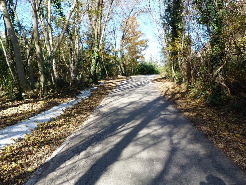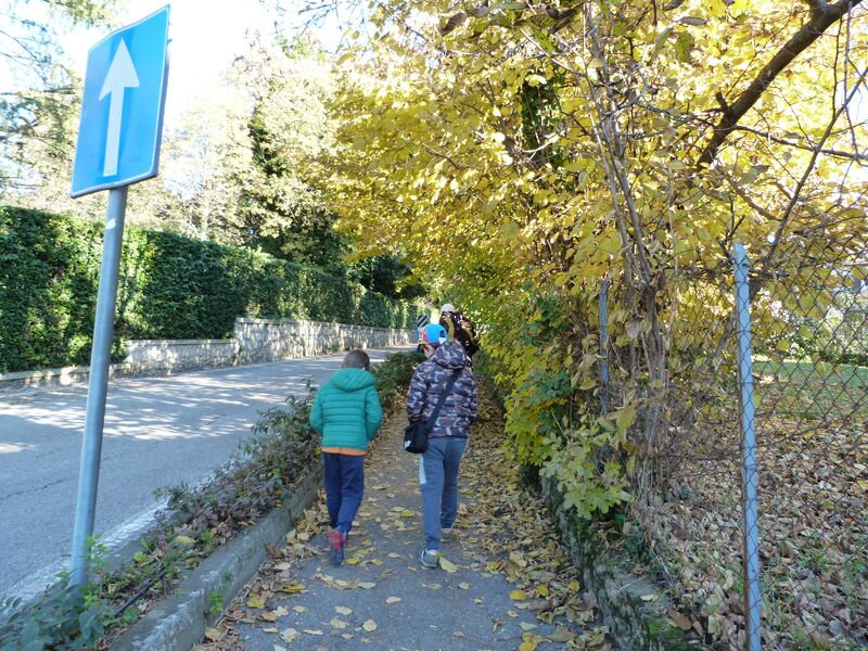 Scesi dall'auto, con la Rocca di fronte a noi andiamo a sinistra e poi su per il sentiero pedonale per agganciare Via Forestuzzo, quindi andiamo verso destra. Ai lati della strada gli alberi ci mostrano i loro colori autunnali.