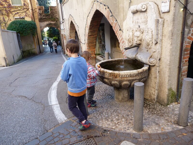 Anche questa viuzza si rivela molto suggestiva, troviamo infatti pecore e caprette. In breve ci ricongiungiamo con Via San Martino e andiamo a destra per poi agganciare Via Foresto Vecchio ed arrivare in centro, ma poco prima saliamo sulla destra per Via Bembo e in men che non si dica siamo nella Piazza principale riconoscibile per la Fontana con il Leone di San Marco.