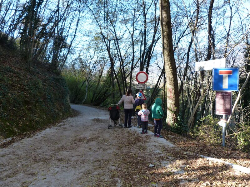 La salita continua con qualche piccola lamentela dei miei tre lanzichenecchi. Guardando più in là, vedo che a sinistra della via è stato posto un cordolo cemento che di primo impatto potrebbe sembrare neve e così mi gioco il Jolly: "Guardate là, c'è la neve!". Indovinate un po', tutti ricominciano a correre per poter tirare le palle di neve.