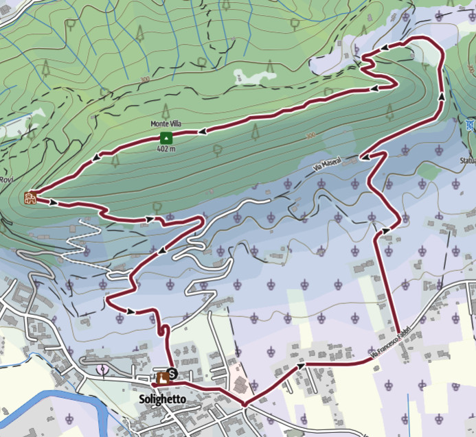 - Descrizione breve: Percorso Monte Villa a Solighetto: camminata non impegnativa verso la vetta e la croce del Monte Villa a Solighetto dapprima tra i vigneti e poi in cresta tra i boschi di carpino, acacia e roverella.