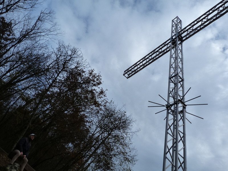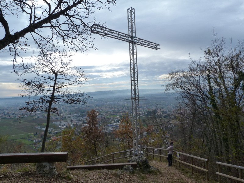 Per fortuna questo pendio non dura molto e in poco tempo siamo al cospetto della Croce del Monte Villa il cui affaccio da sulla pianura coperta da nubi basse. Un timido sole sta cercando di farsi spazio tra le nuvole, vediamo se per la fine del nostro cammino avrà la meglio.