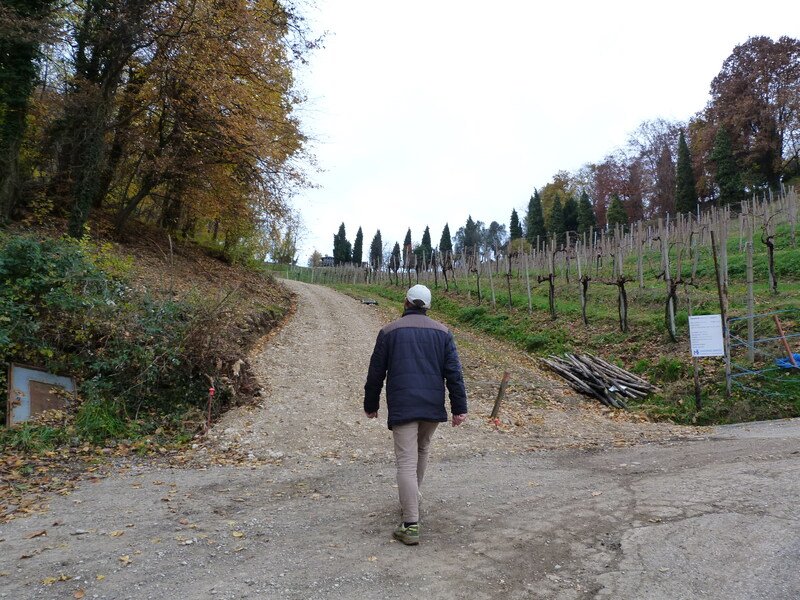 Raggiungiamo Via Drio Cisa e giriamo a sinistra, iniziando pian piano la nostra ascesa, alcuni viticoltori stanno lavorando tra le viti pulendo gli spazi tra i filari. Evelina non riesce e riscaldarsi ed accelera il passo; intorno a noi come potete immaginare vitigni, casolari rurali e se ci giriamo indietro il panorama, oggi grigio, sulla pianura trevigiana.