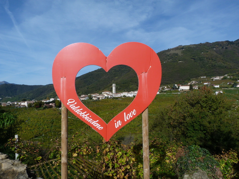 We pass an old farmhouse, a little roadside shrine dedicated to Saint Anthony, and a beautifully restored country house with a tasting area and a selfie sign that says “Valdobbiadene in Love,” with a great view toward San Pietro di Barbozza. Many of the houses and barns around here have been carefully renovated — keeping their rustic charm while blending perfectly into the landscape.