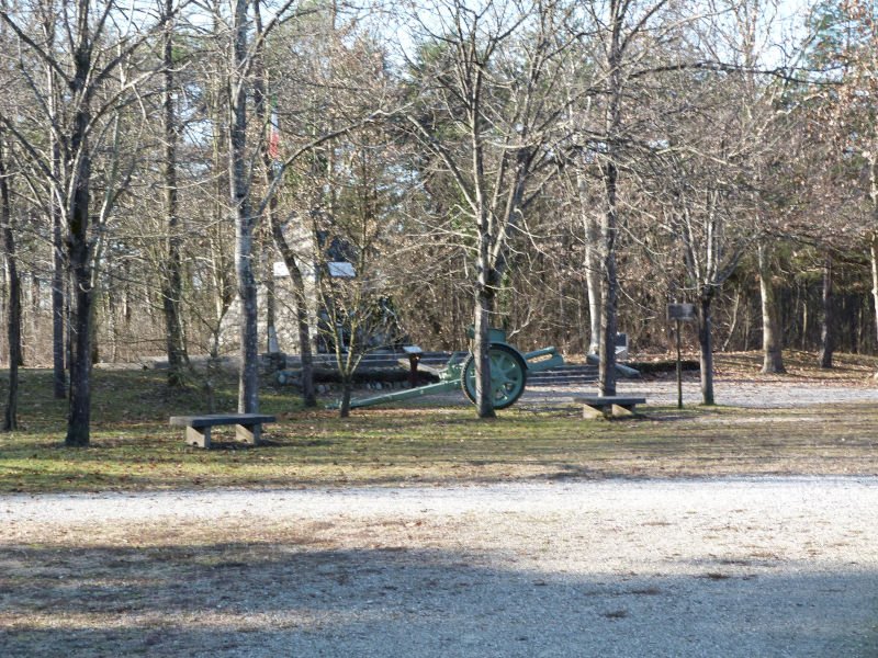 Sulla destra svettano alcuni pini e raggiungiamo il primo piazzale di questo parco, proseguiamo diritti e raggiungiamo un piccolo laghetto. I bimbi vorrebbero fermarsi ma faccio vedere a Marco i cannoni all'orizzonte e lui si mette quasi a correre per raggiungerli. In breve siamo al Piazzale dei Ragazzi del 99 e passiamo in rassegna i vari monumenti.