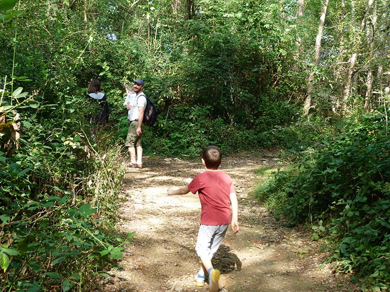 Sebastian è affascinato dalle felci che si trovano copiose lungo i lati del sentiero. Superiamo il primo bivio andando dritti e poi alla biforcazione successiva teniamo la sinistra; in mezzo al bosco possiamo intravedere i resti di una casa diroccata. La superiamoe in poco tempo siamo sulla strada asfaltata (Via Lama).