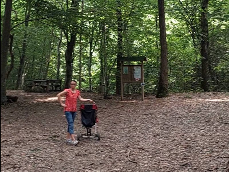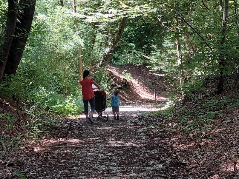 Proseguiamo lungo il sentiero blu, la via si fa più stretta e in qualche tratto ci sono delle radici sporgenti che fanno sobbalzare il passeggino per il divertimento di Samuele.