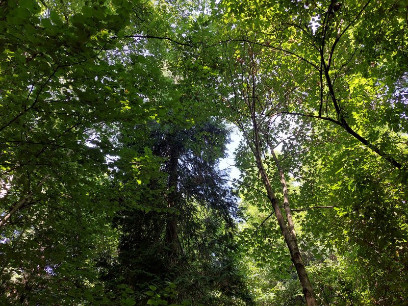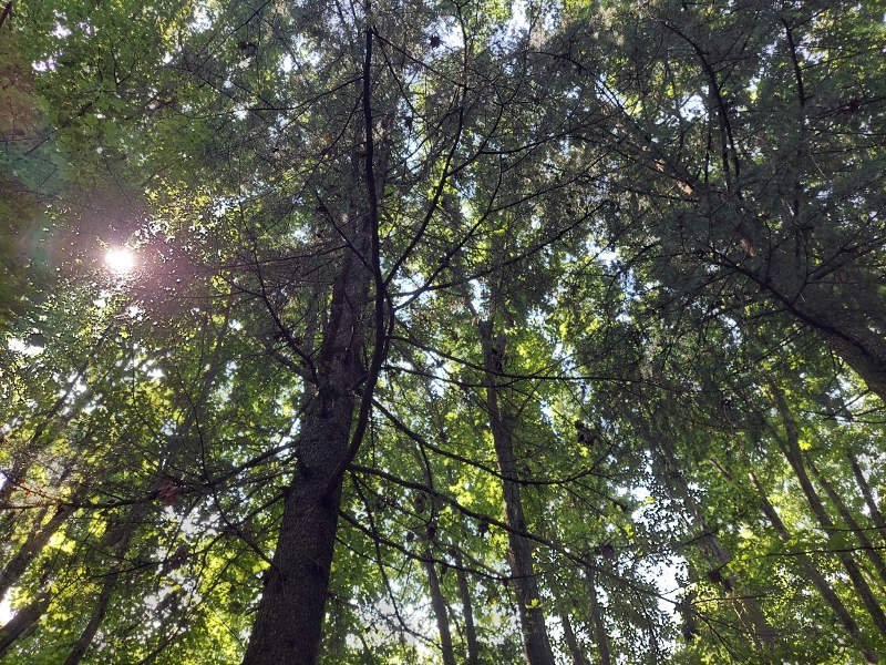 Mi fermo un attimo e guardo verso il cielo tra i rami di pino mossi dal vento per scorgere il sole. Noi facciamo un po' di casino come al solito, ma credo qui regni una grande pace. Poco più in là una radura assolata non mi fa per nulla rimpiangere questa zona completamente ombreggiata.