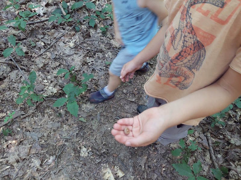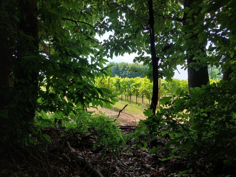 Continuiamo il cammino e alla nostra sinistra scorgiamo un vigneto. Marco inizia a raccogliere qualche ghianda da portare a casa; alla fine si riempirà ben due tasche.