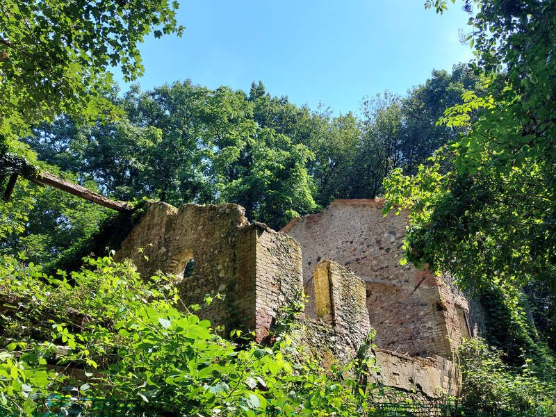A bordo del sentiero Sebastian scorge una grande ragnatela ed agevolmente arriviamo ad un'area con panchine ed un rudere.