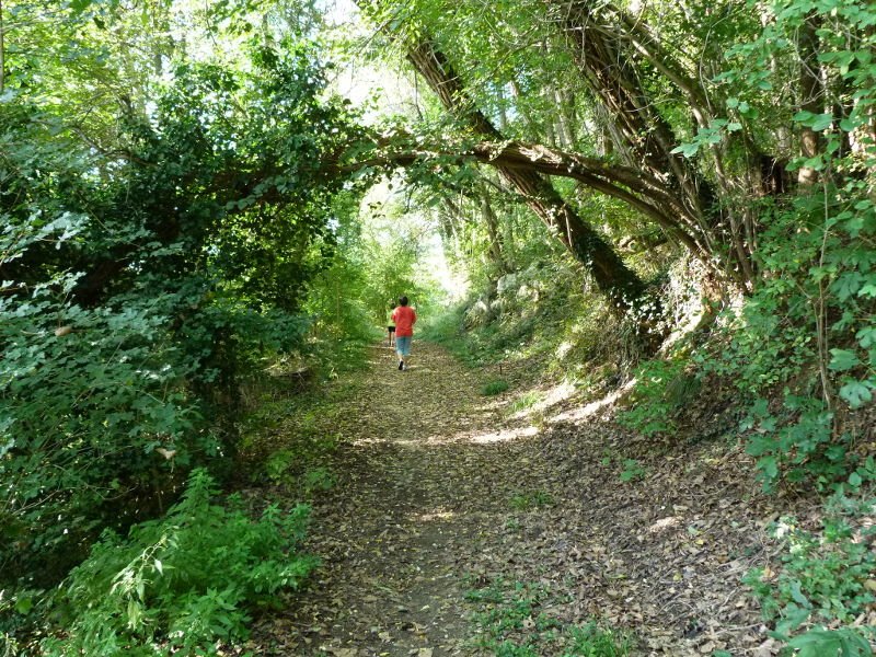 Scendiamo per la scalinataLe chiome degli alberi cominciano a perdere il loro verde lussureggiante, preparandosi all'autunno. La stradina ha un dislivello minimo e ci godiamo l'ambiente circostante tra uliveti, filari di vite e altre alberature.
