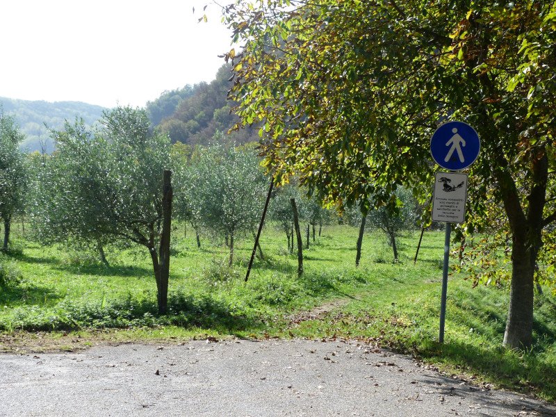 E' tempo di rimetterci in cammino anche se distogliere Evelina dalla ricerca di noci ed erba è sempre un'impresa ardua. Raggiungiamo la strada asfaltata del cimitero e andiamo a destra. Proseguendo vediamo il cartello di percorso pedonale e lo seguiamo.
