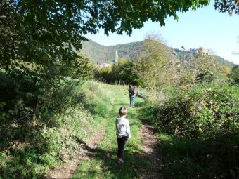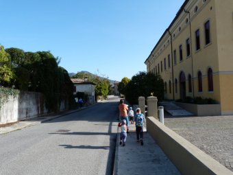 Raggiunta una panchina andiamo a sinistra, le alberature si fanno più rade. Alla nostra sinistra un muretto e poi a destra una casera. Evelina sparisce in cerca di noci ma non ne trova nemmeno una. Raggiunta un'edicola scendiamo sulla destra e poco dopo di fronte a noi appare il campanile di Valmareno.