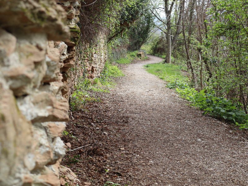 E' tempo di mettersi in marcia, prendiamo la strada che corre sul lato destro del Tempio (Via Giardin), tra il verde degli uliveti spunta un albero con una bella fioritura color bianco. Qualche passo e deviamo verso destra, imboccando il percorso pedonale.